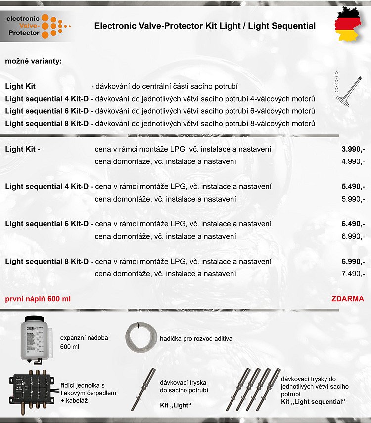 Tyto sady jsou k dispozici v provedení pro 4, 6 nebo 8válcové motory. K hlavním výhodám oproti mechanickým dávkovačům patří přesnost a stálost dávkování, odpadá tak nutnost neustálé kontroly a nastavování jehlového ventilku dávkovače. Soupravy této sady „Light" jsou určeny pro běžné nepřeplňované motory.